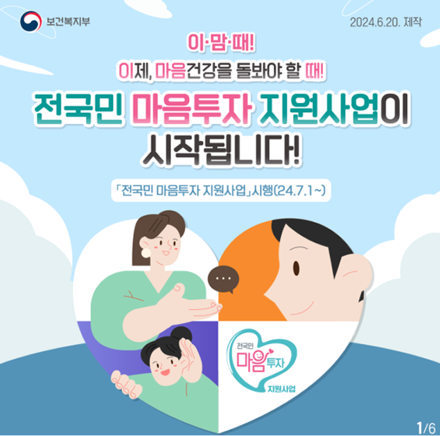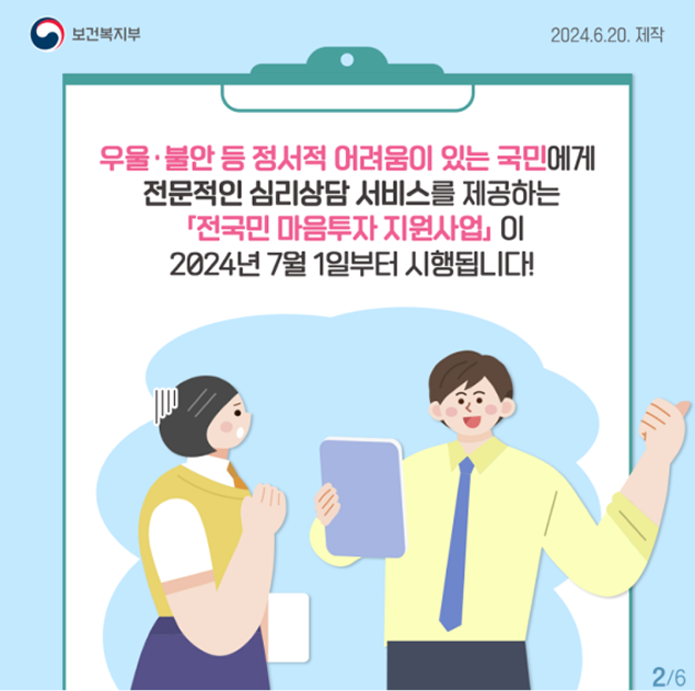 정부가 시행하는 전국민을 위한 심리상담 서비스입니다. 우울, 불안 등 정서적 어려움이 있는 국민 누구에게나 전문 심리상담 서비스를 제공하여, 국민의 마음 건강을 돌보고, 정신질환을 예방하는 것을 목적으로 하는 정부사업입니다.